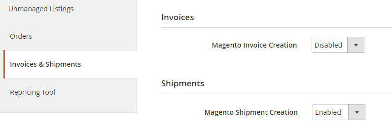 Na kartě Faktury a zásilky (Amazon > Konfigurace > Účty > Upravit účet) můžete nastavit M2E Pro tak, aby automaticky vytvářel faktury a zásilky ve vašem Magentu. Chcete-li to provést, nechte povolené možnosti Vytváření faktur/zásilek Magento: