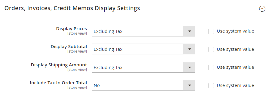 Kromě daňových pravidel existují obecná daňová nastavení Magento, která určují konečnou výši daně v objednávce. Tato nastavení se nacházejí v části Obchody > Nastavení > Konfigurace > Prodej > Daň :