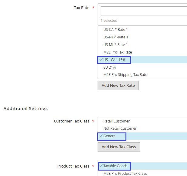 Při konfiguraci nového daňového pravidla Magento automaticky použije výchozí daňové třídy produktů a zákazníků zadané v nabídce Obchody > Nastavení > Konfigurace > Prodej > Daň pro konkrétní webovou stránku / zobrazení obchodu.