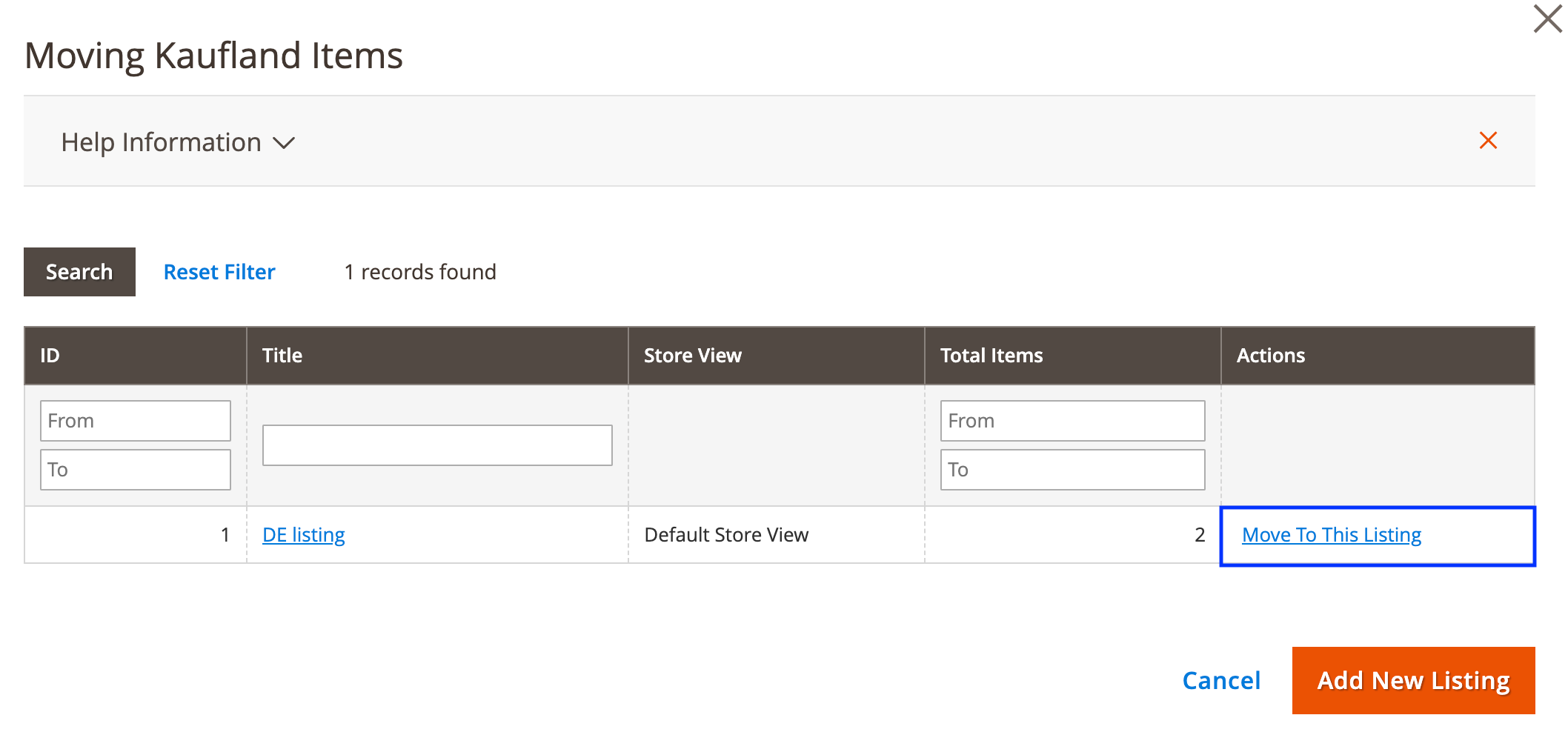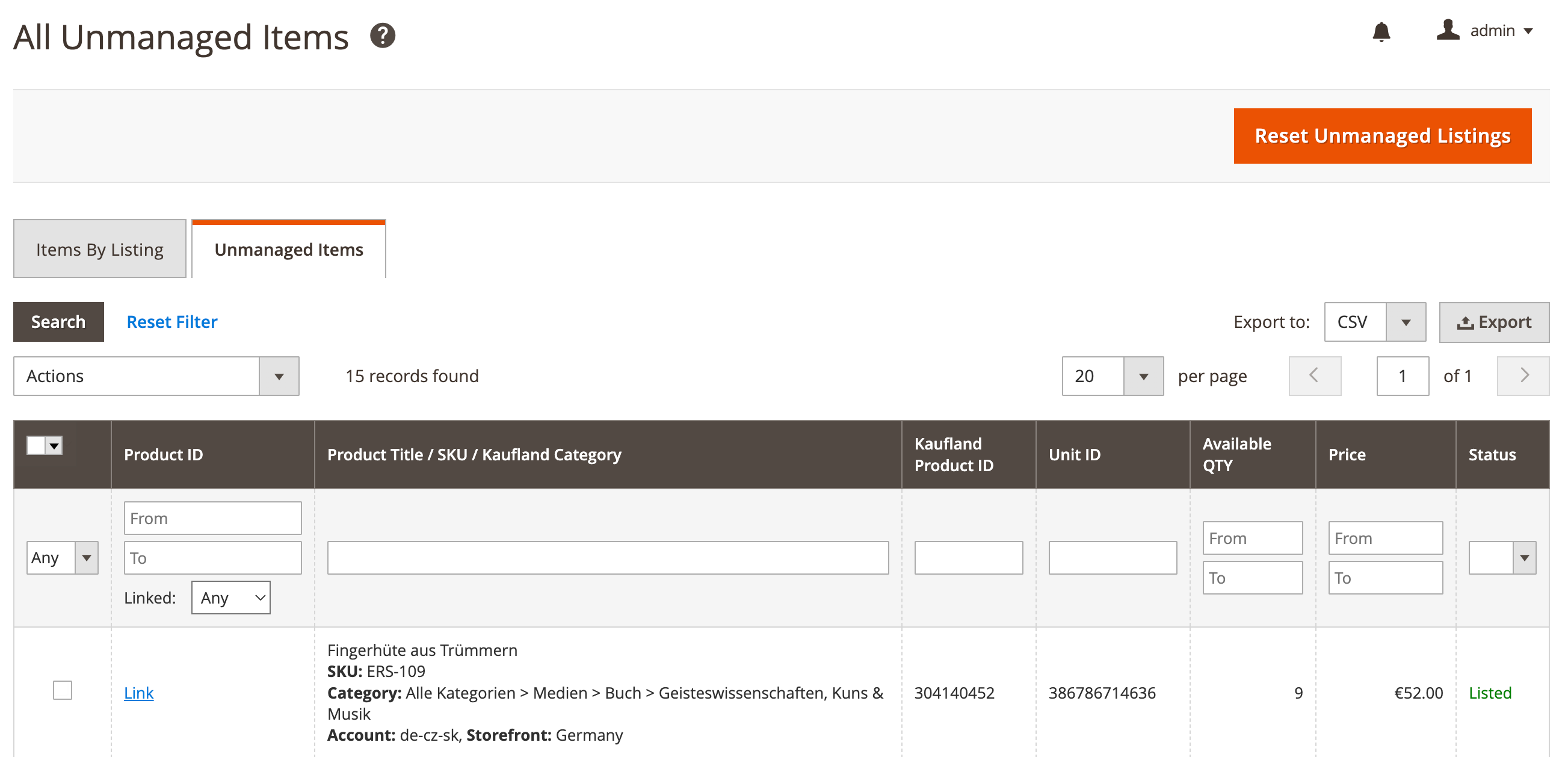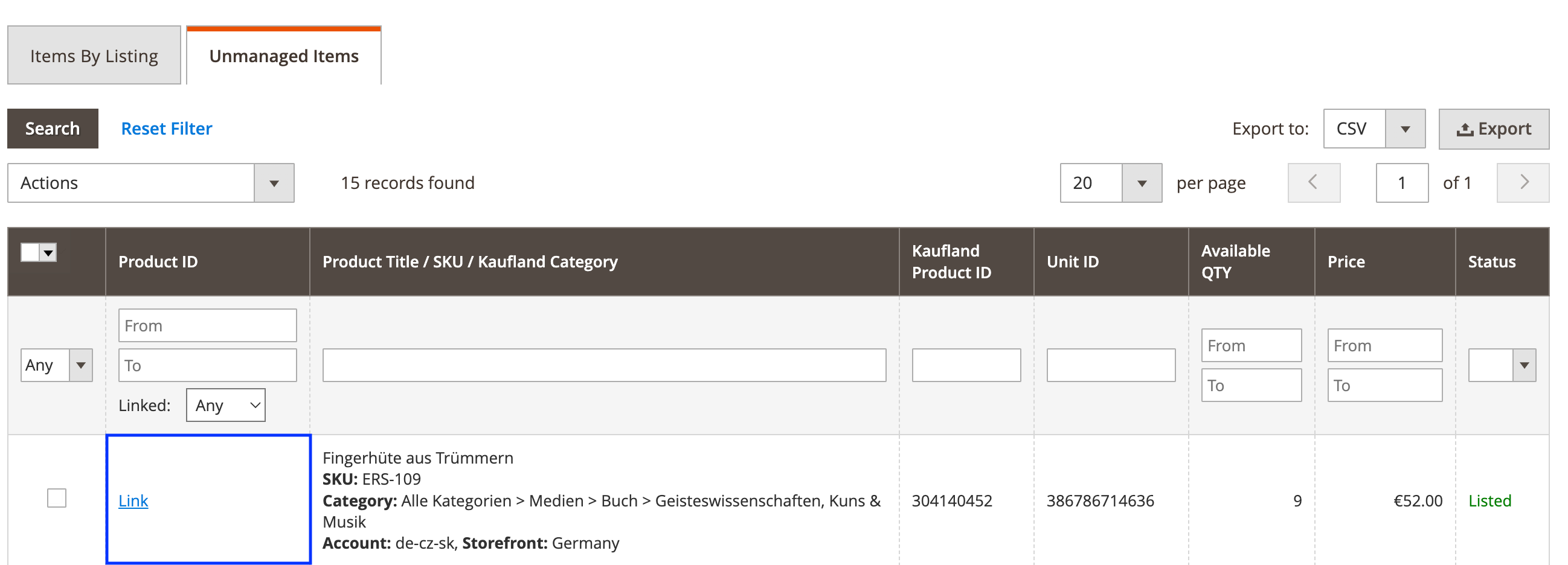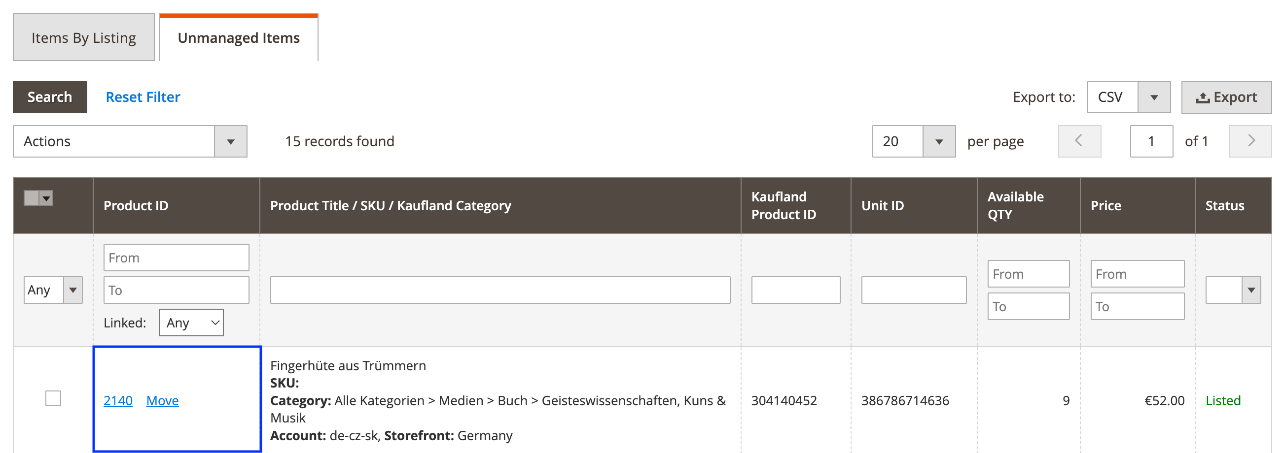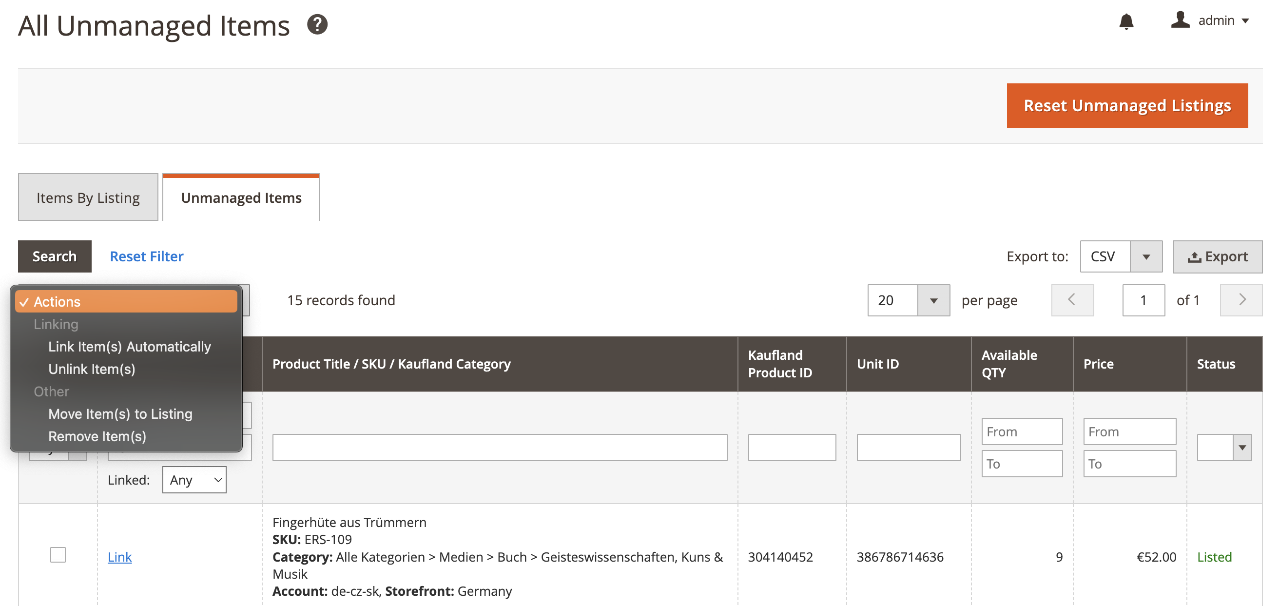 Než rozšíření začne spravovat vaše nespravované položky, je třeba je propojit s příslušnými produkty Magento a přesunout je do Nabídky M2E Kaufland. Podrobné pokyny jsou uvedeny níže.