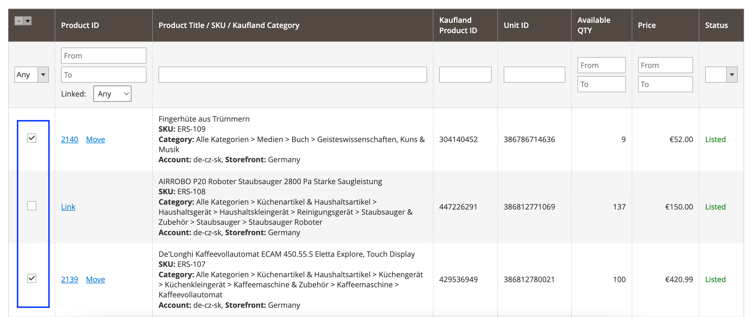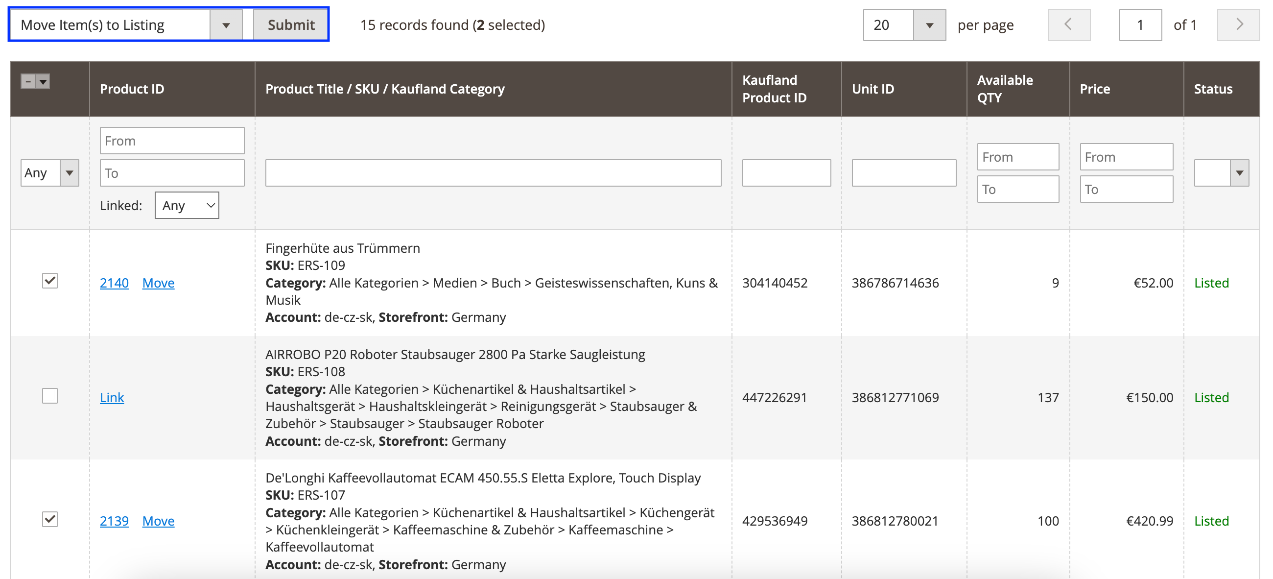 Po propojení položek je lze přesunout do Nabídky M2E Kaufland. Akci Přesunout můžete použít na každou položku zvlášť nebo položky spravovat hromadně.