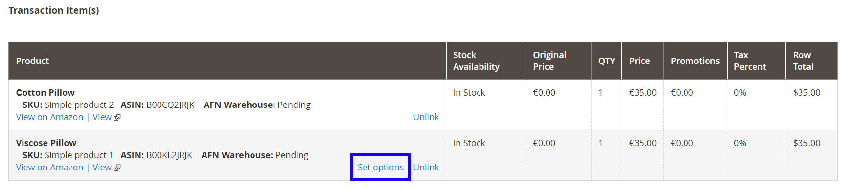 Chcete-li propojit produkt Magento s položkou v objednávce Amazonu, klikněte na příslušné tlačítko vedle položky v sekci Transakční položka (položky) na stránce s podrobnostmi o objednávce: