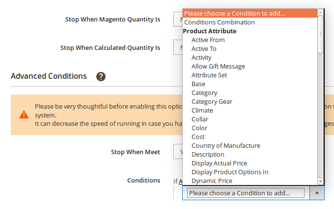 - Klicken Sie auf das +Symbol, um ein Auswahlfeld anzuzeigen, und wählen Sie die gewünschte Option unter Produktattribute aus dem Dropdown-Menü.