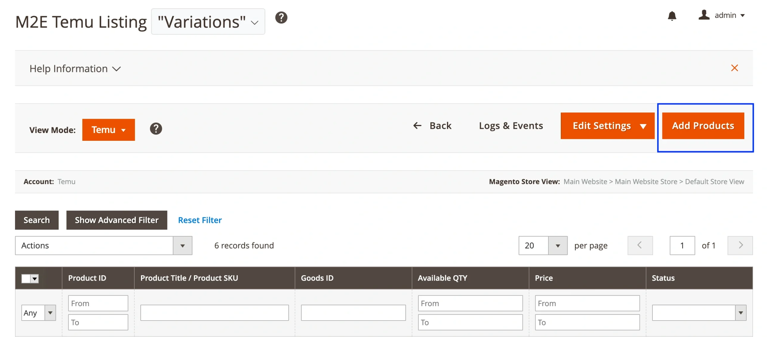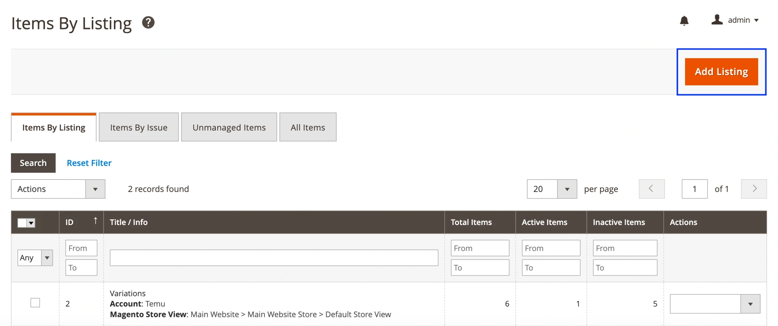 If you already have an M2E Temu Listing created, you can add Configurable Products to it. Go to Listings > Items, open the existing Listing, and click Add Products.