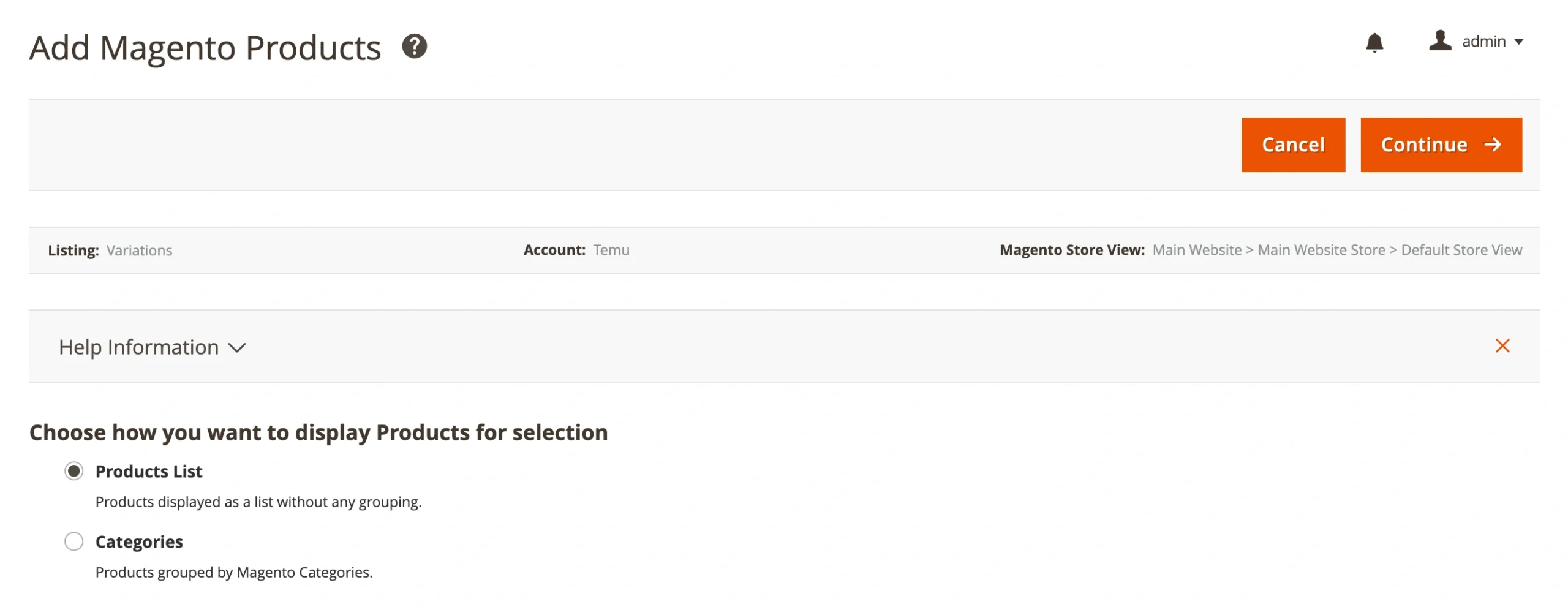 When adding products to your M2E Temu Listing, choose how you want to view them: