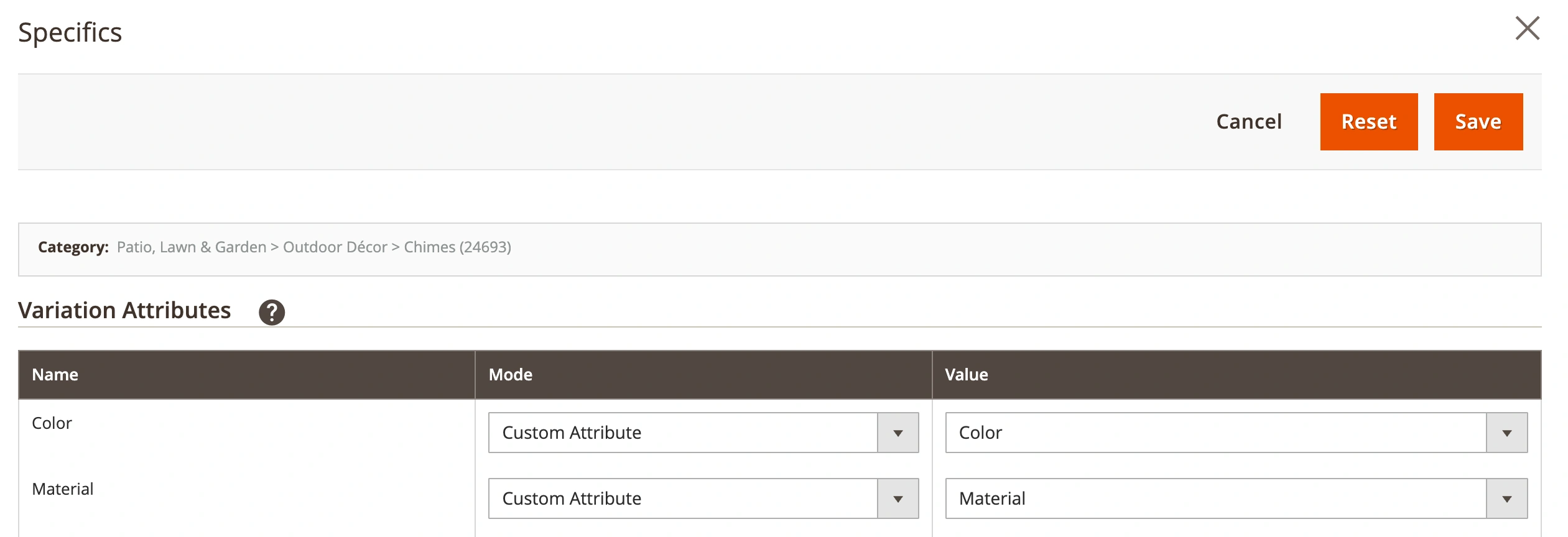 - Choose Custom Value if the variation is the same across all items or is not stored as a Magento attribute.