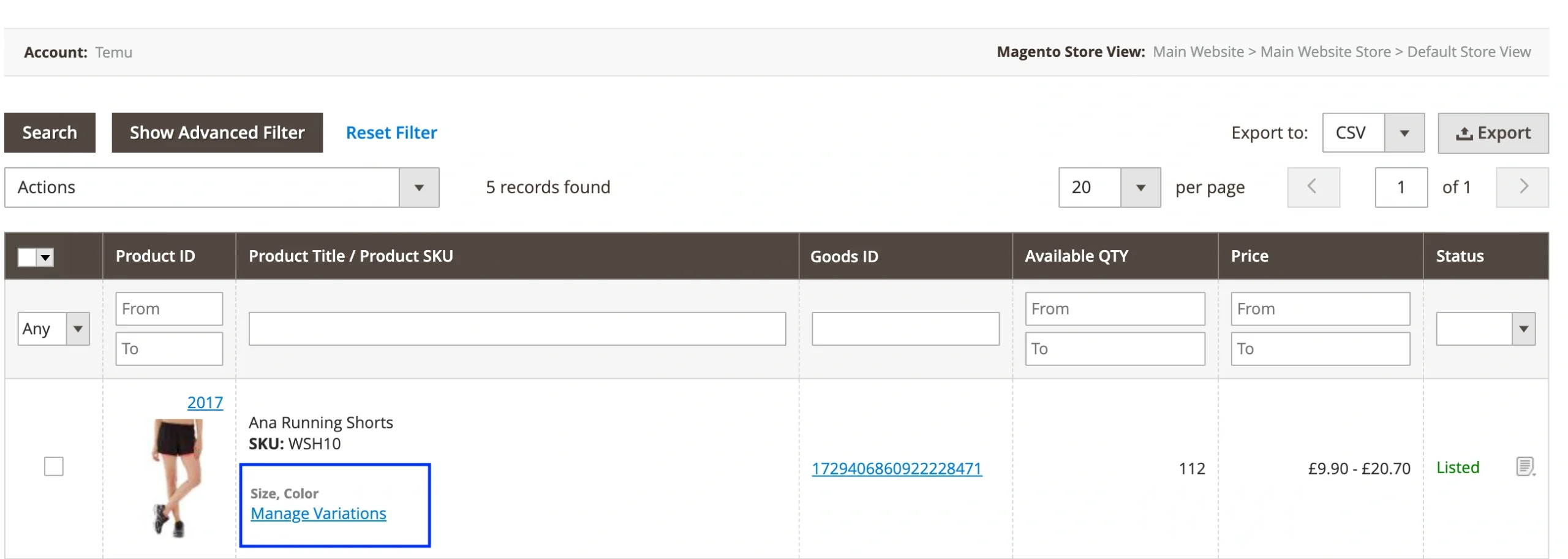 After your products are listed, you can manage each variation in the M2E Temu Listing interface. For that, click Manage Variations next to the listed item:
