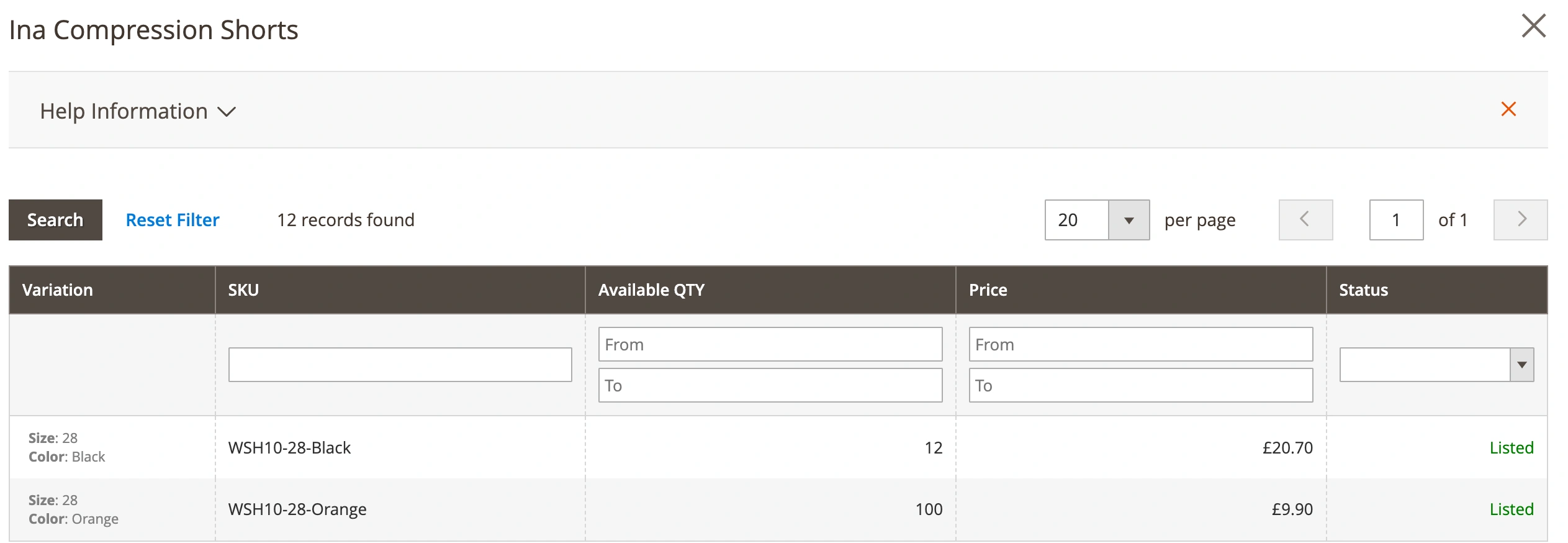 You can view and edit the price, quantity, and status for each variation, as well as use column filters to sort, search, and locate specific options.