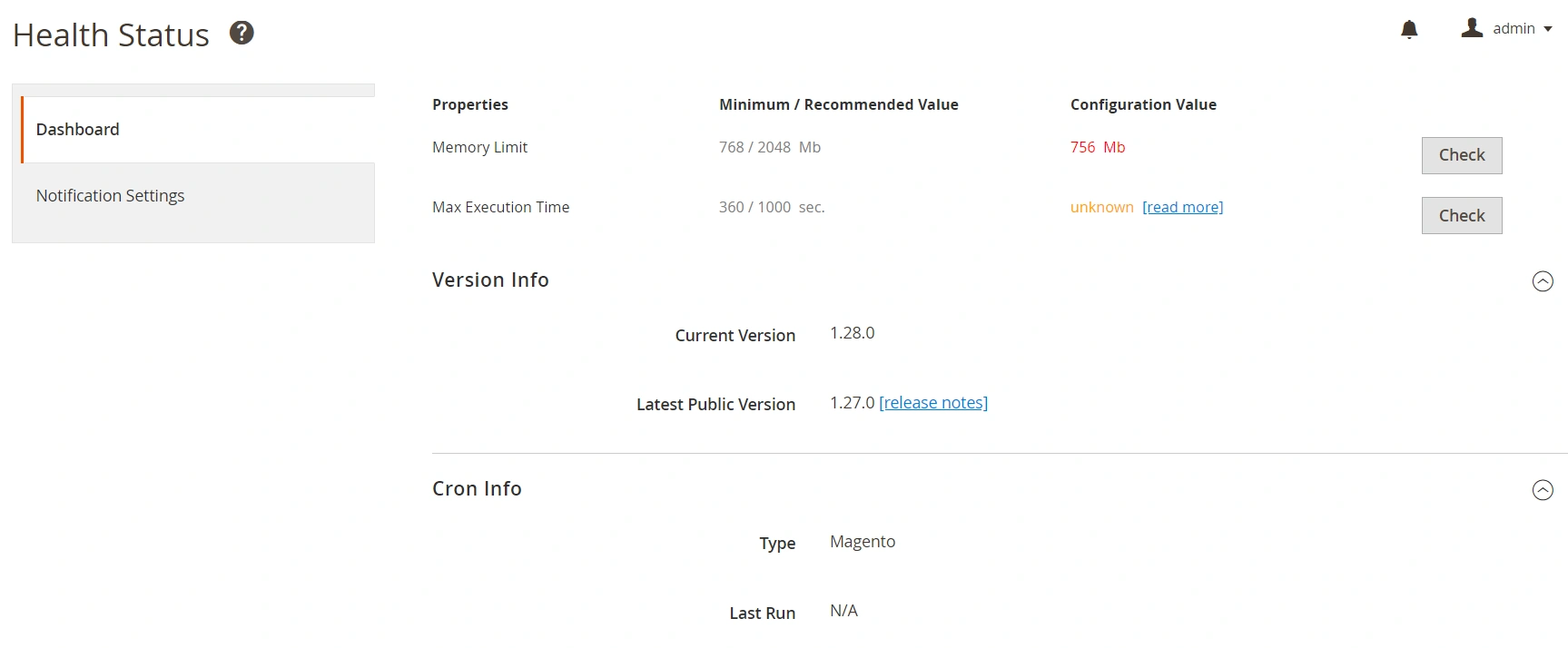 The Dashboard page allows you to view technical info on your M2E Pro instance, such as system requirements, current M2E Pro version, Cron details, as well as check and test the configuration values of your server.