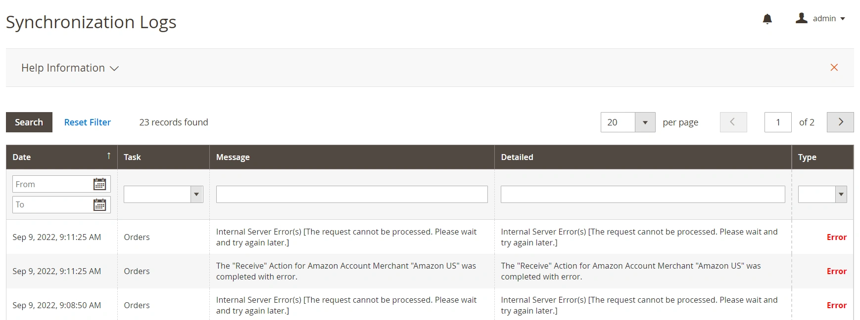 On this page, you can keep track of issues occurring during Listings, Unmanaged Listings, Order, or Marketplaces synchronization.