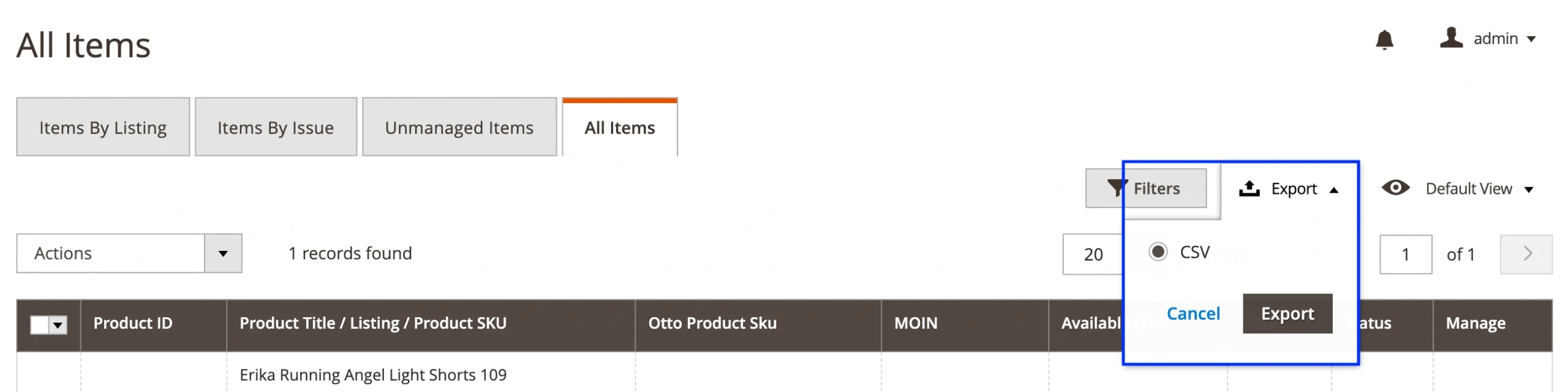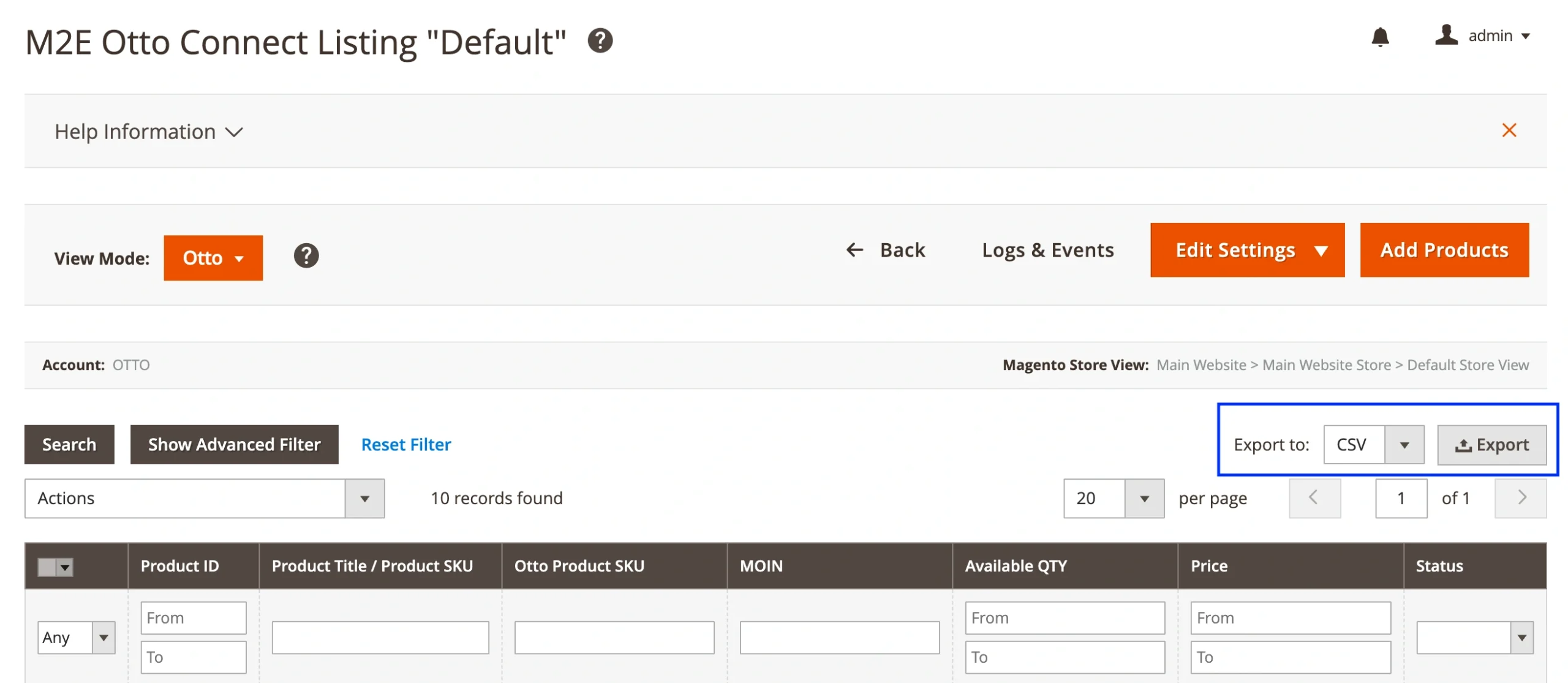 Go to Listings > Items > All Items in your M2E OTTO Connect panel. Click the Export button on the right side of the grid. This will generate a CSV with all the OTTO products you manage through M2E.