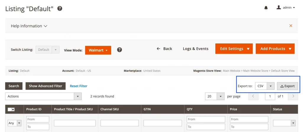 By exporting your Walmart listings to CSV, you can check key product information, share it with your team, or use the data when preparing for Magento product export workflows.