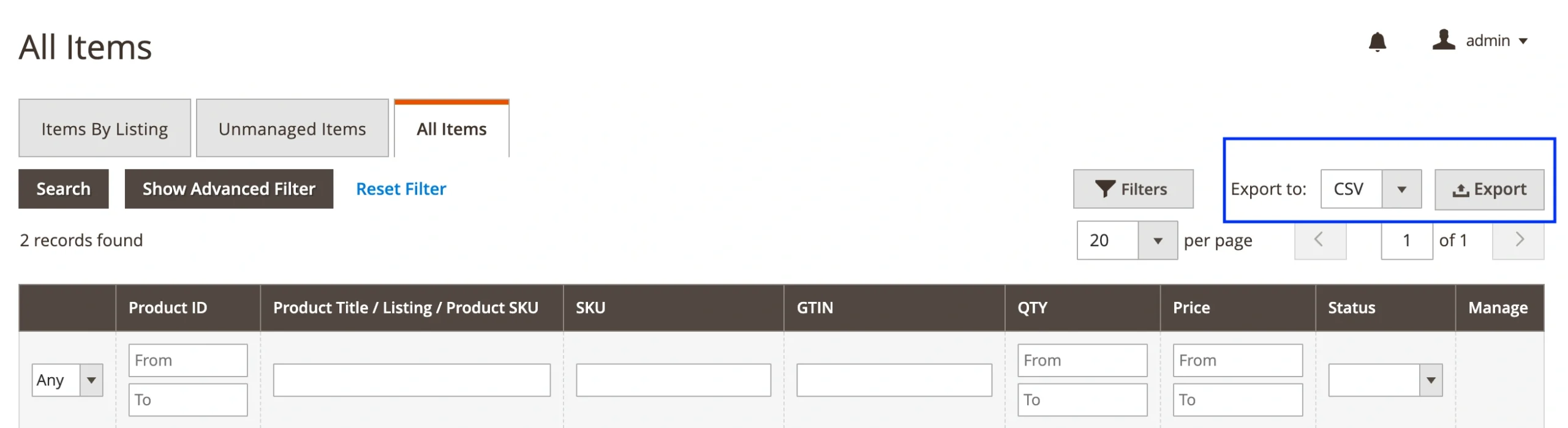 If you only want to export products from a particular M2E Pro Listing, go to Listings > Items > Items by Listing. Select the listing you need and click the Export button in the top-right corner of the grid.