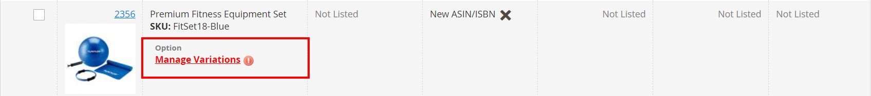 To manually match Magento Variations with Amazon Variations, click Manage Variations next to the Product in the grid.
