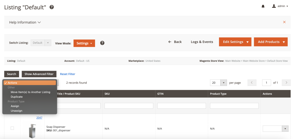 Using the Actions menu, you can assign/unassign a Product Type to the selected products or move them to a different M2E Pro Listing, etc.