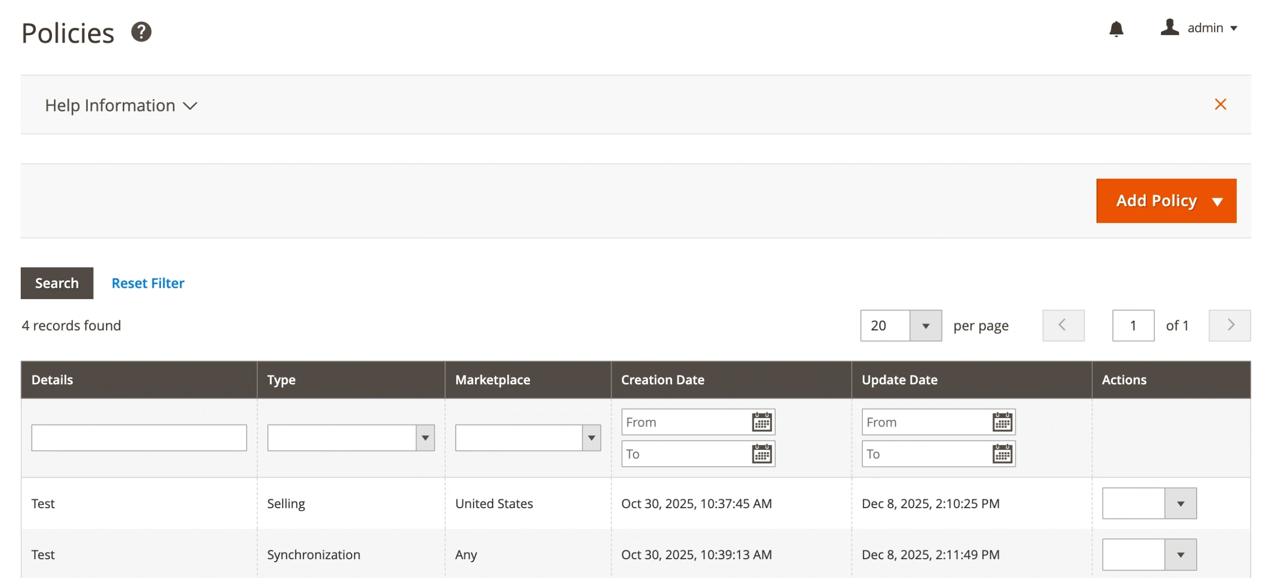 Navigate to Walmart > Configuration > Policies in M2E Pro. Add a new Repricer Policy, which will be used for products with Walmart repricing enabled.