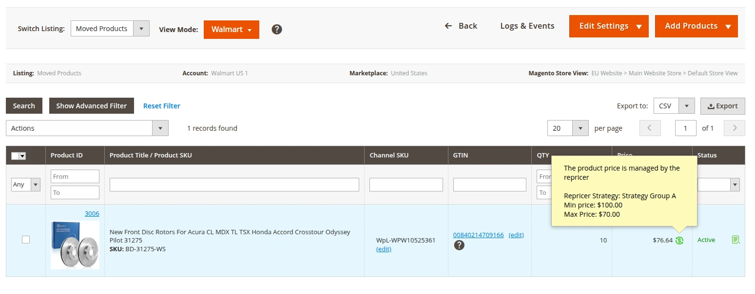 In the M2E Pro Listings grid, products using repricing will be marked with a special icon: