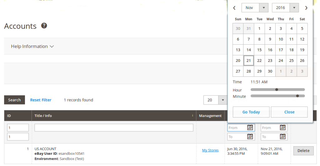 - Next, you should navigate to eBay Integration > Configuration > Accounts grid and click on the My Stores link.