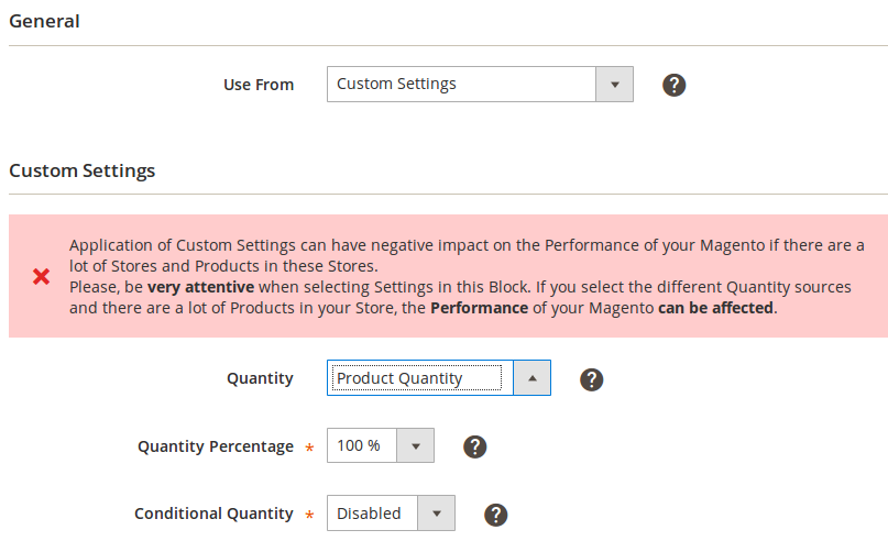 2) Custom Settings—The settings allow selecting the Quantity source and specifying the Percentage and Conditional Quantity Options for this particular Store.