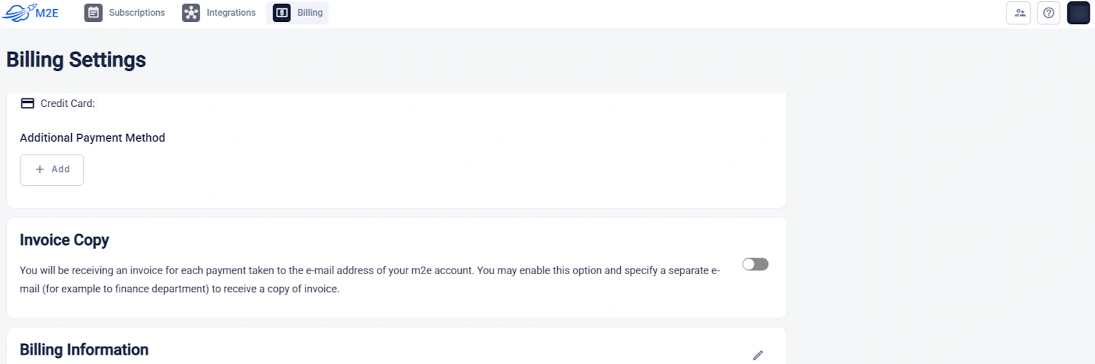 You can view and edit your personal and billing details via your profile in M2E Accounts under the Billing and Account sections: