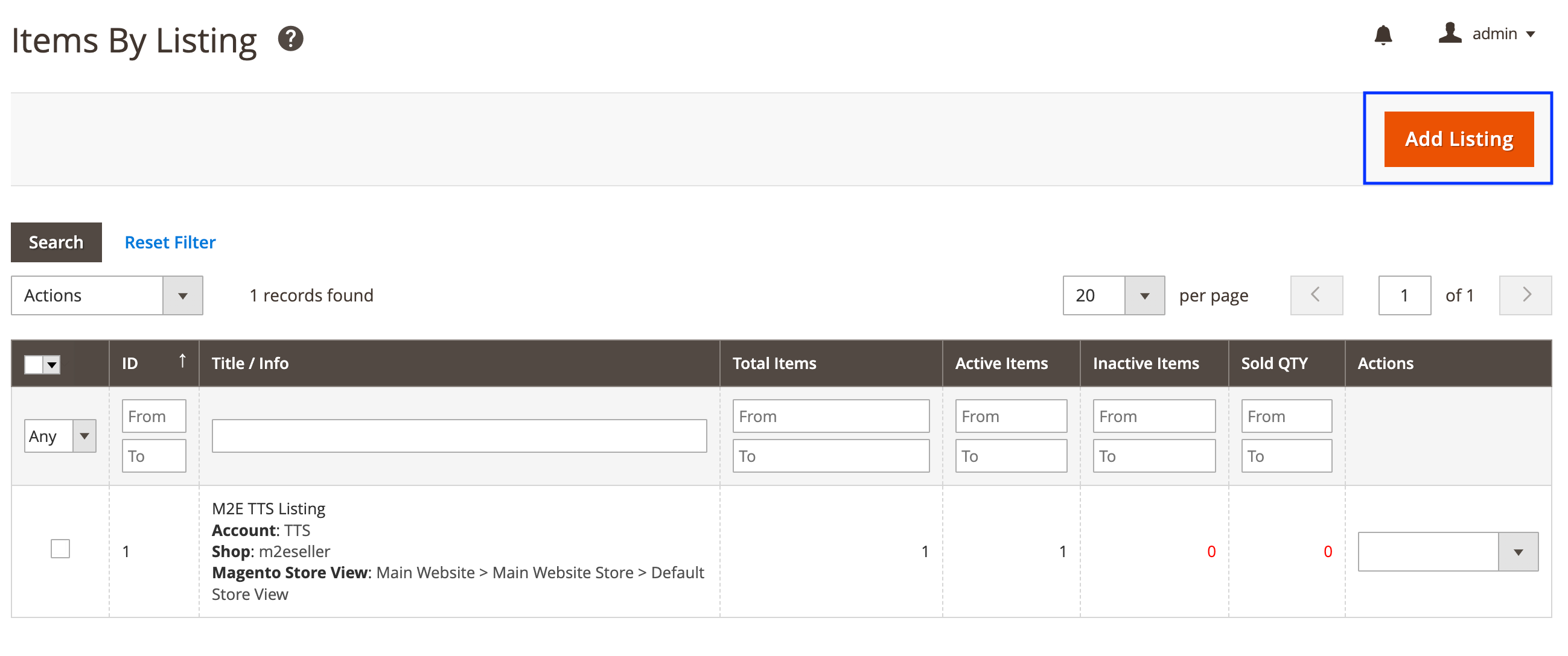 The Items by Listing page displays all your M2E TTS Listings. To create your first Listing, click on the corresponding button in the top right corner of the page and go through the listing creation process.