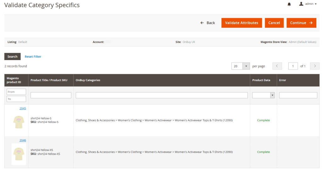 The system checks that Magento attributes mapped to OnBuy fields meet format, data type, and value requirements. For example, if a category requires a specific size, the value must fall within OnBuy’s accepted range. Any validation errors must be fixed by updating or adding the correct attributes.