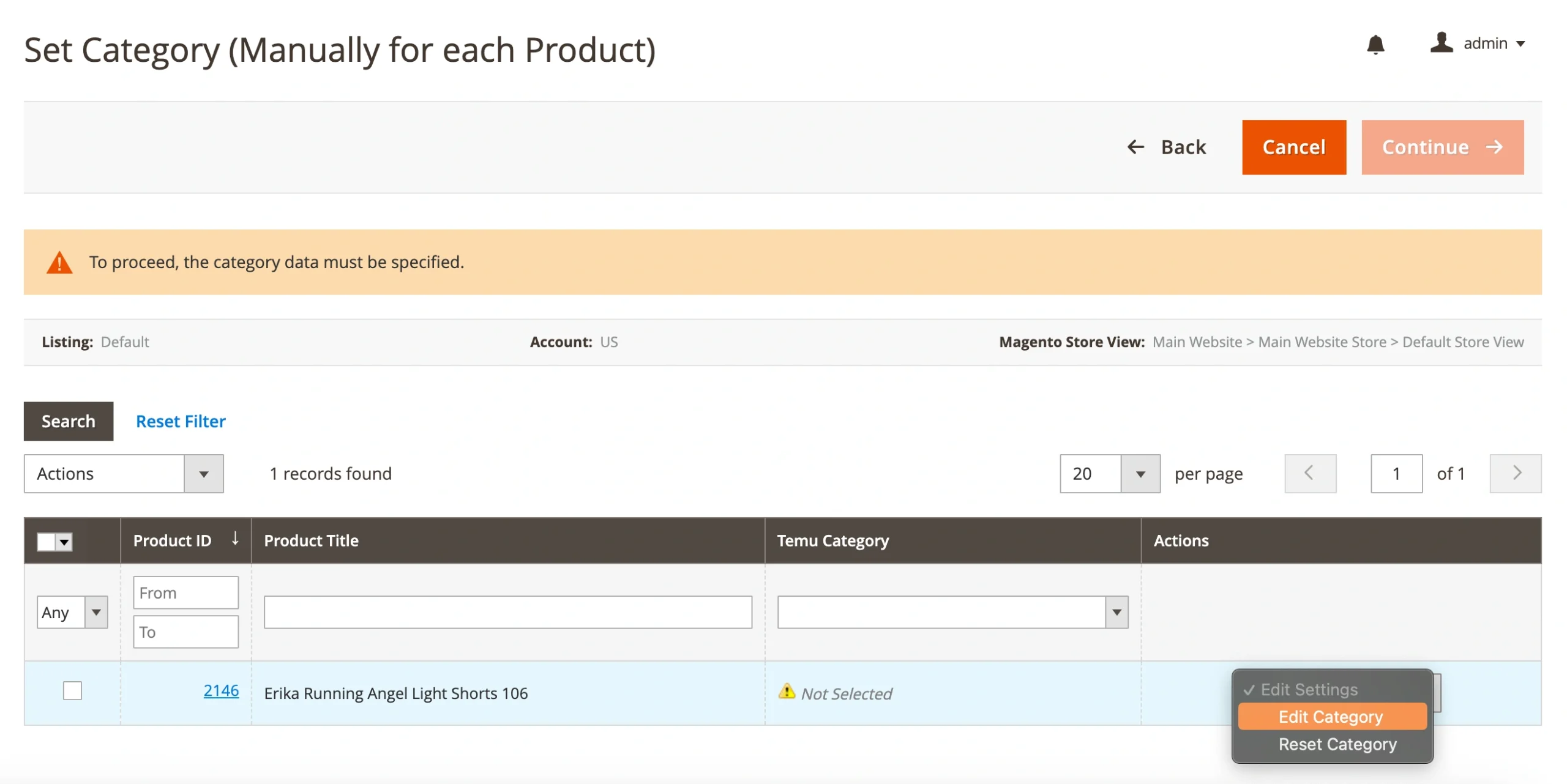 Once you’ve selected products to be added to your M2E Temu Listing, you will need to assign them to the appropriate category. For that, choose the preferred category settings first.