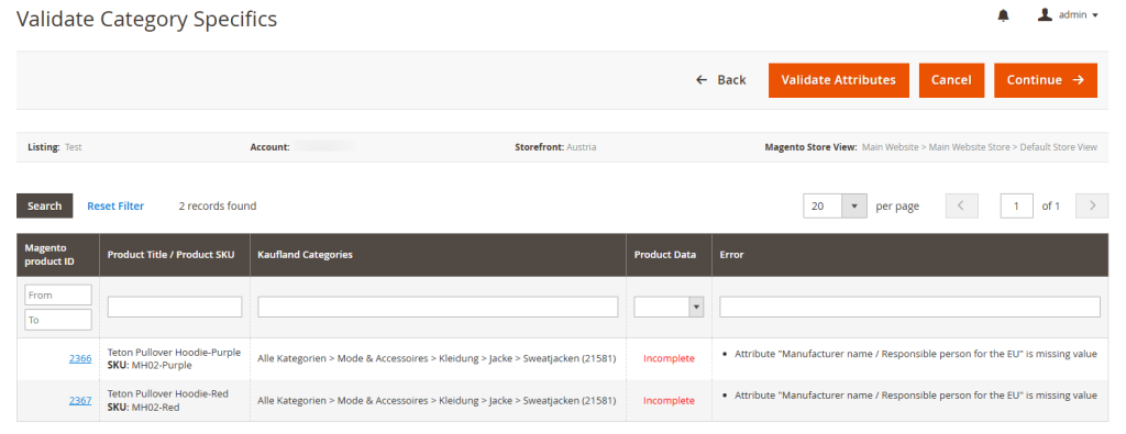 The system checks that Magento attributes mapped to Kaufland fields meet format, data type, and value requirements. For example, if a category requires a specific size, the value must fall within Kaufland’s accepted range. Any validation errors must be fixed by updating or adding the correct attributes.