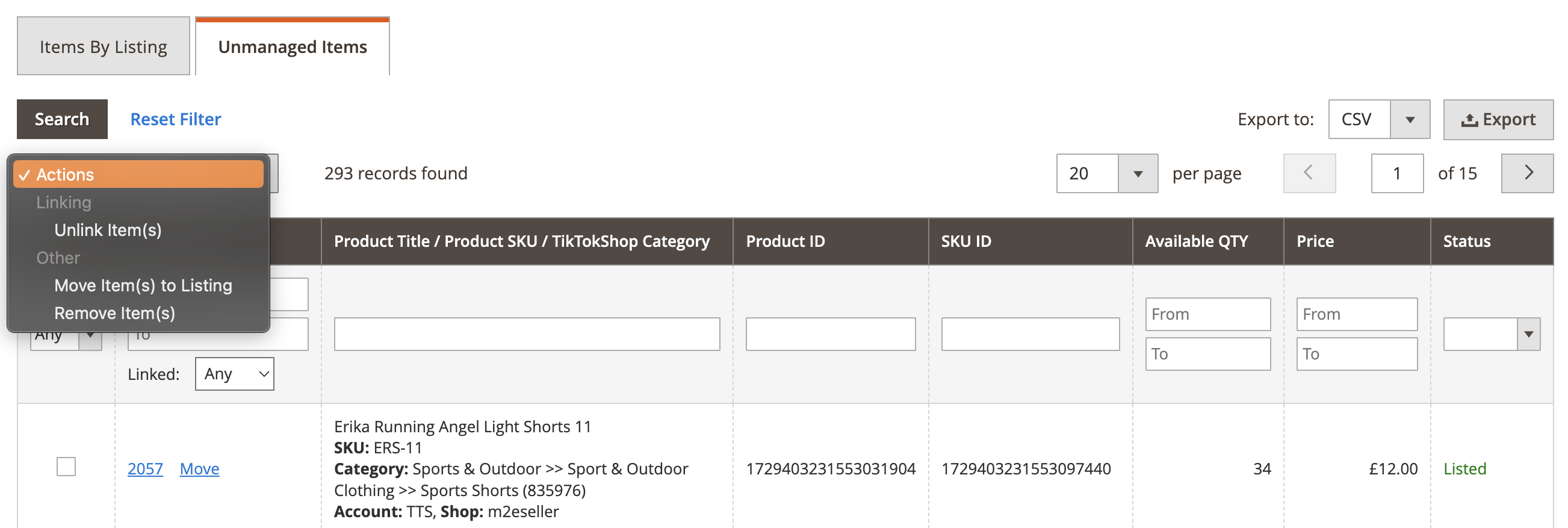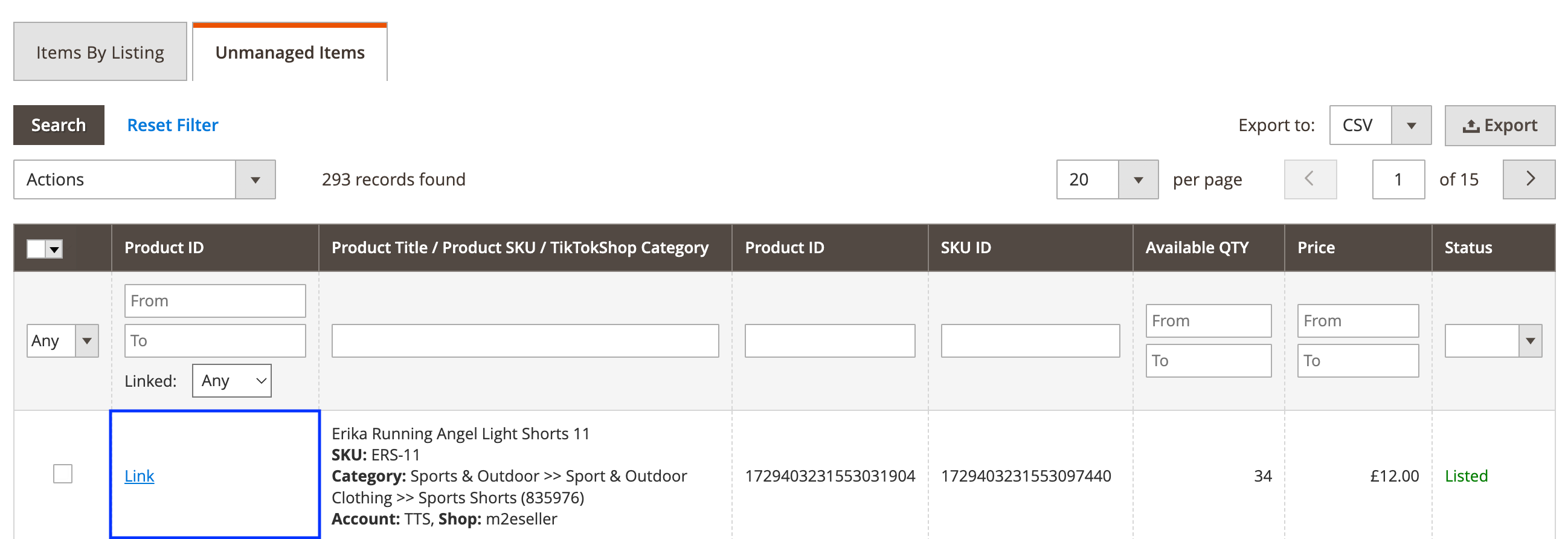 ℹ️ You can export all Unmanaged TikTok Shop items and their data to a CSV file. For that, click Export in the top right corner of the grid.