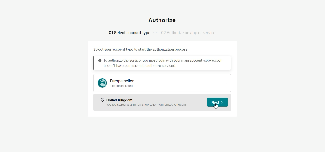 Serás redirigido a la página de autorización de TikTok Shop, donde tendrás que seleccionar el tipo de cuenta que quieres añadir.
