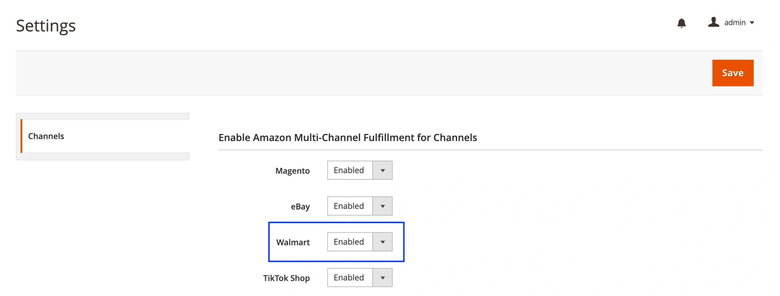 Vaya a Configuración > Ajustes > Canales y habilite MCF para Walmart. A partir de ahí, Amazon se encargará de almacenar, recoger, empaquetar y enviar, mientras que M2E gestiona el enrutamiento del pedido y mantiene sincronizados los detalles de tu pedido de Walmart.