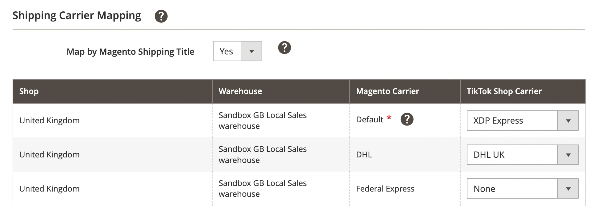 Si tu tienda Magento utiliza códigos de transportista personalizados, puedes habilitar la asignación de entrega basada en el título del transportista. Configura la opción Map by Magento Shipping Title en Sí para permitir que M2E Connect coincida los transportistas de TikTok Shop usando el título proporcionado en el envío de Magento.