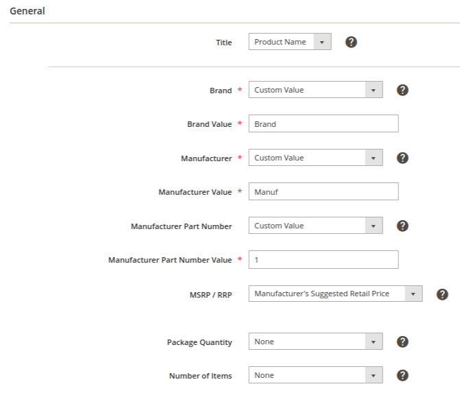 - Fabricant – spécifiez le nom du fabricant de votre produit via une valeur personnalisée ou un attribut Magento. La valeur est limitée à 50 caractères.