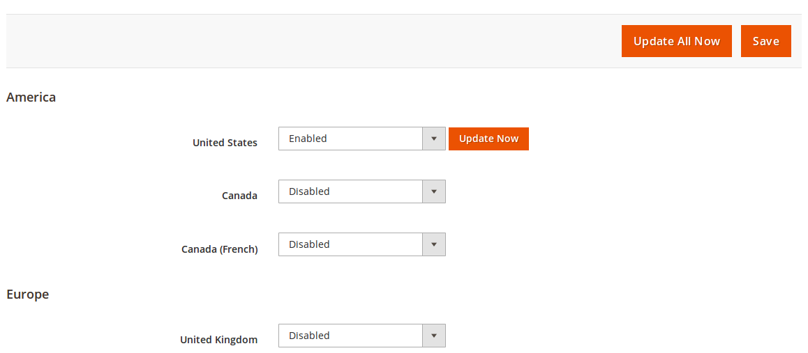 Il existe 23 places de marché majeures sur eBay avec lesquelles M2E Pro peut interagir. Vous devez activer celles sur lesquelles vous allez vendre, puis cliquer sur Enregistrer. Pour mettre à jour toutes les données des places de marché eBay activées, cliquez sur Mettre à jour tout maintenant.
