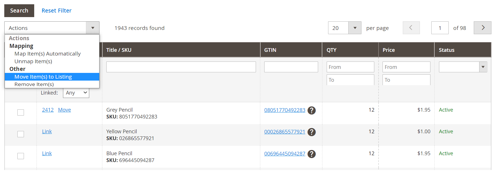 ✅ L'action Lier à un autre produit Magento est disponible uniquement pour les objets déplacés depuis la liste des annonces non gérées.