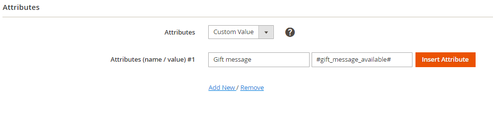 Des informations supplémentaires peuvent améliorer la performance de votre offre. Si vous avez besoin d'indiquer un certain paramètre du produit qui n'est pas présenté parmi les options de politique de vente par défaut, vous pouvez ajouter un attribut personnalisé. Saisissez un nom et une valeur d'attribut ou cliquez sur Insérer pour utiliser une valeur de l'attribut Magento sélectionné.