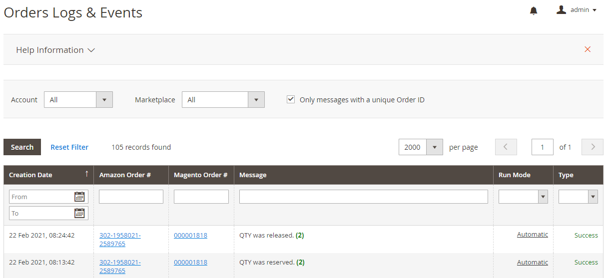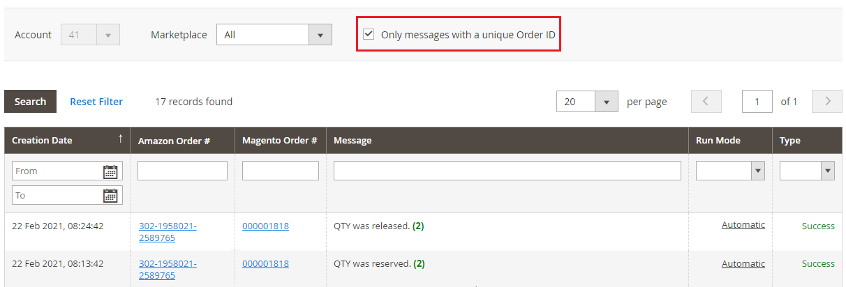 Rejestr zamówień pozwala śledzić, jakie zamówienia, wysyłki lub faktury Magento zostały utworzone dla odpowiednich zamówień Amazon. Aby przejrzeć zapisy, przejdź do sekcji Integracja z Amazon > Sprzedaż > Rejestry i zdarzenia.