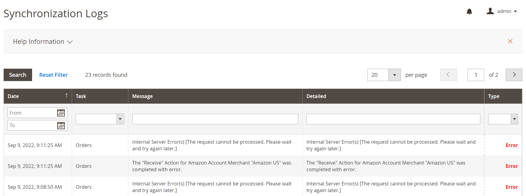 Dzienniki synchronizacji ostrzegają o problemach, które wystąpiły podczas synchronizacji M2E Pro Oferta, Unmanaged Oferta, Zamówienia, Marketplace itp. Odpowiednie zapisy można sprawdzić, przechodząc do sekcji Amazon Integration > Centrum pomocy > Dzienniki synchronizacji.
