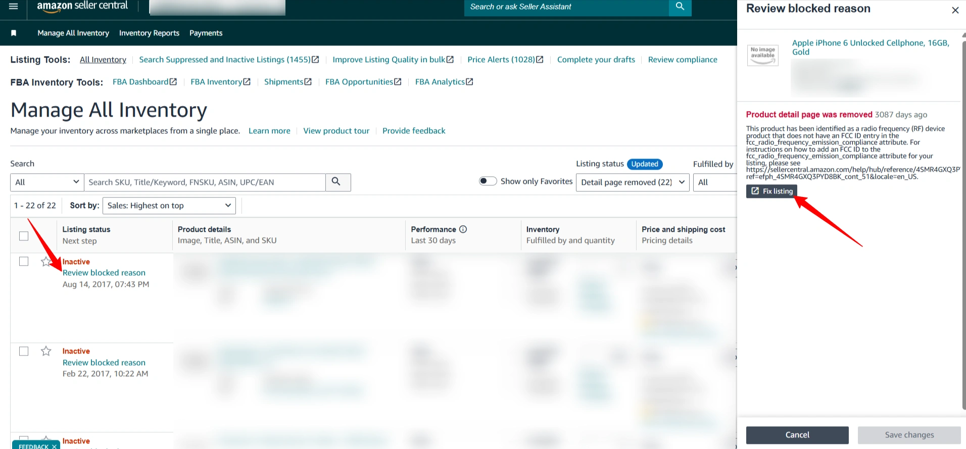 1. Zarządzaj wszystkimi zapasami > Sprawdź przyczynę blokady > Napraw ofertę.