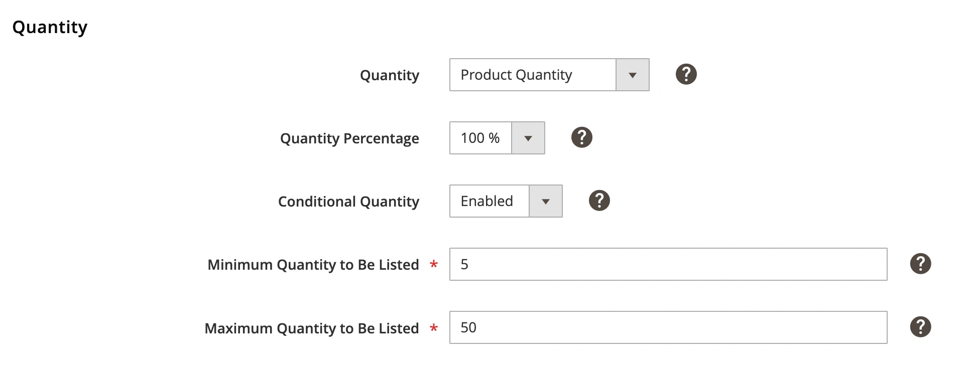 Warunkowa ilość (dostępna tylko, gdy wybrano Ilość produktu lub Atrybut Magento) – pozwala ustawić maksymalną i minimalną liczbę produktów do sprzedaży na Temu.minimalnej liczby pozycji do sprzedaży w Temu.