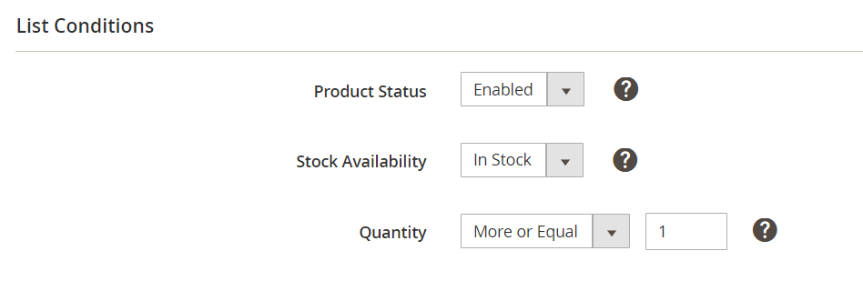 - Stock Availability – określ, które produkty mogą być automatycznie wyświetlane na liście w zależności od ich dostępności w Magento