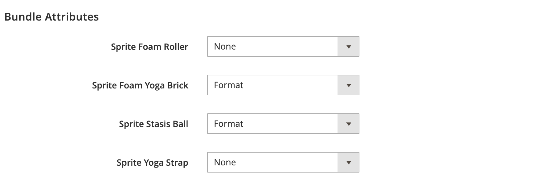Você encontrará uma lista de todos os nomes padrão das opções de produtos agrupados do Catálogo Magento. Para cada um deles, você pode selecionar um atributo Magento relevante para atribuir nomes de variações personalizados.