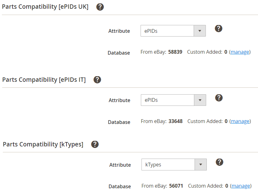 Você pode configurar isso na seção Integração com o eBay > Configuração > Definições > Parts Compatibility > Parts Compatibility [kTypes IT] (usando o banco de dados TecDoc).