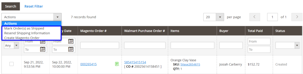 - Shipped - a Shipment is created for a corresponding Magento order or Walmart order is marked as Shipped directly on the Channel.