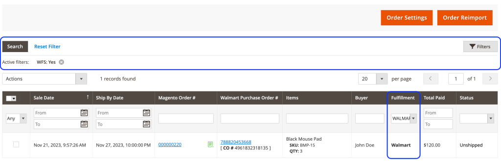 To find your Walmart-fulfilled orders easily, use the Fulfillment column and the dedicated WFS filter: